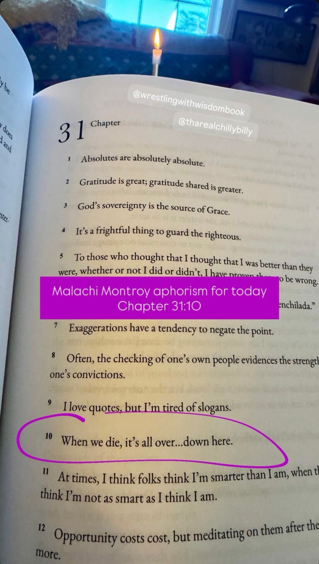 Each morning during our devotional time together, Billy and I select a Malachi Montroy aphorism from the chapter corresponding to the day of the month, along with a poem. We read them aloud and talk through how they apply to our lives on that given day. This often leads to rich discussion, especially following our Bible readings from Psalms, Proverbs, and the New Testament, along with whatever other book we are reading together. At the moment, that happens to be Mere Christianity by C.S. Lewis.