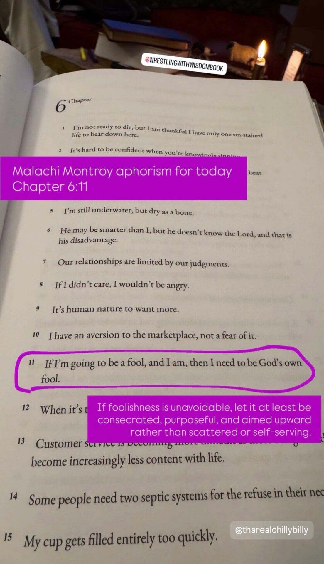 Each morning during our devotional time together, Billy and I select a Malachi Montroy aphorism from the chapter corresponding to the day of the month, along with a poem. We read them aloud and talk through how they apply to our lives on that given day. This often leads to rich discussion, especially following our Bible readings from Psalms, Proverbs, and the New Testament, along with whatever other book we are reading together. At the moment, that happens to be Mere Christianity by C.S. Lewis.